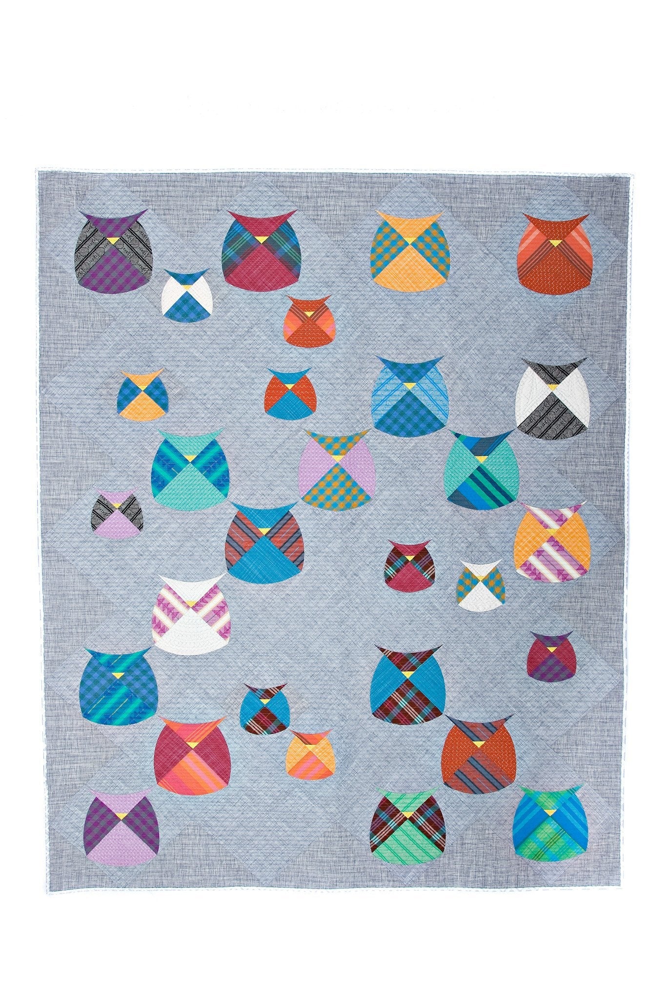 Quilt size : 62 x 75 Materials: (19) fat eighths (9 x 21) assorted prints for large owls (10) fat eighths assorted prints for small owls (1) fat eighth for owl beaks 5 yards background fabric 4 1/2 yards backing 1/2 yard binding