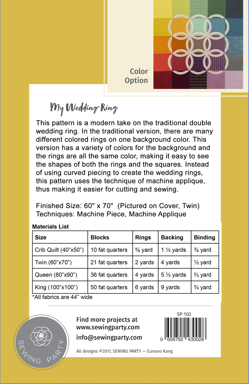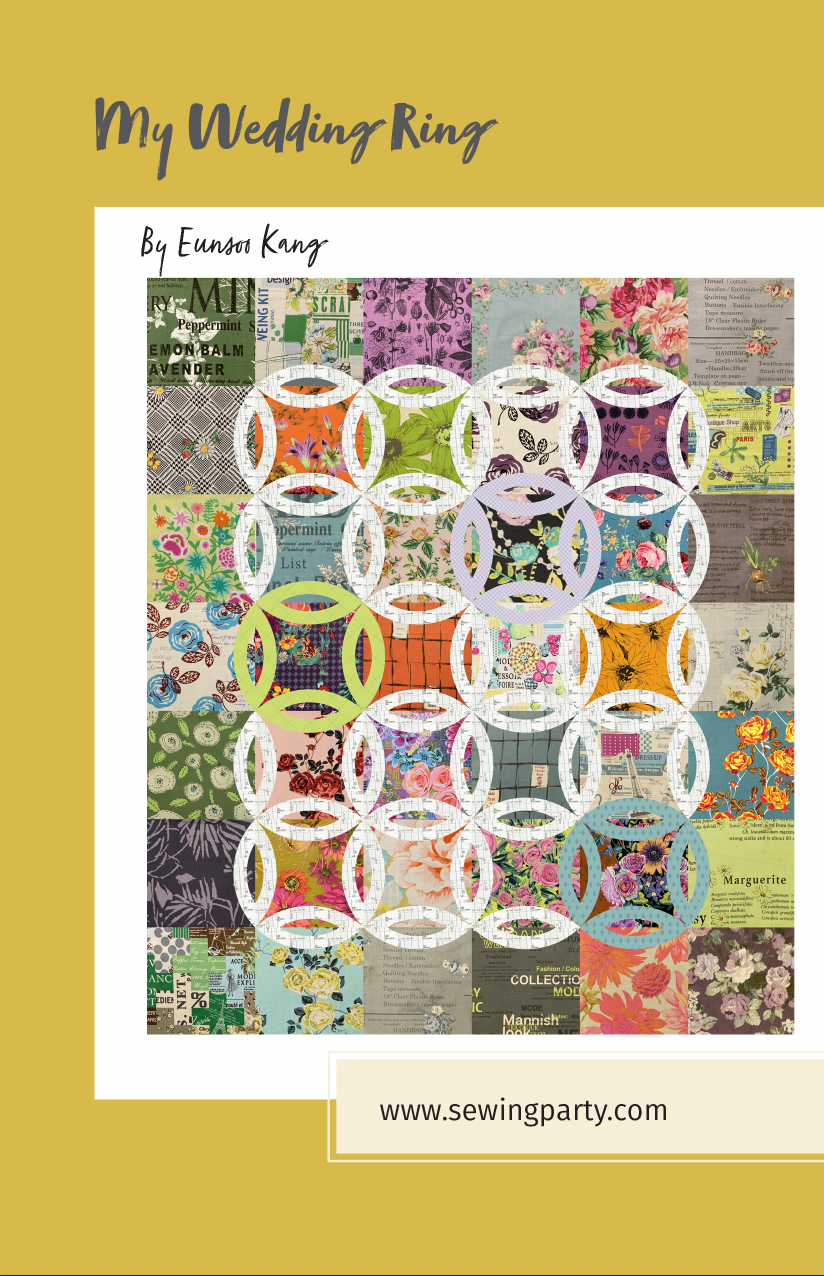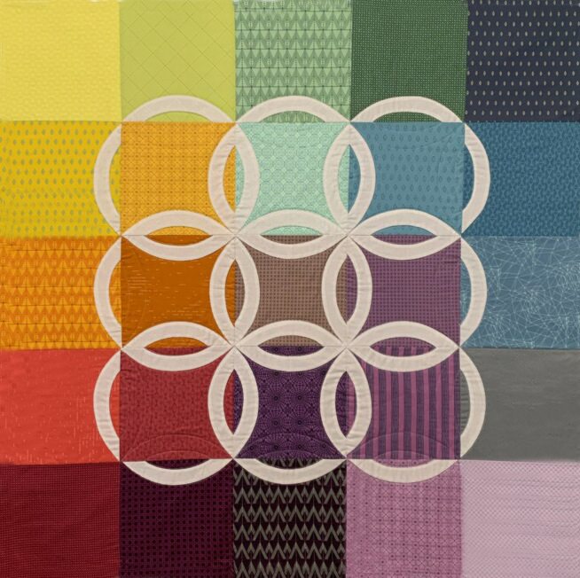 This pattern is a modern take on the traditional double wedding ring. In the traditional version, there are many different colored rings on one background color. This version has a variety of colors for the background and the rings are all same color, making it easy to see the shapes of both the rings and the squares. Instead of using curved piecing to create the wedding rings, this pattern uses the technique of machine applique, thus making it easier for cutting and sewing.